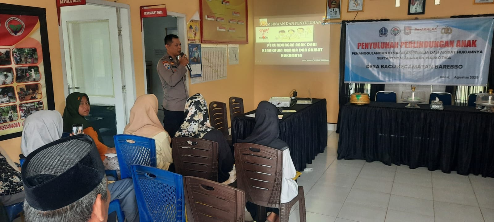 BONE – Apala, Dalam upaya meningkatkan kesadaran masyarakat terhadap pentingnya perlindungan anak serta mencegah kenakalan remaja dan penyalahgunaan narkotika, Bhabinkamtibmas Polsek Barebbo mengadakan kegiatan penyuluhan di Desa Bacu, Kecamatan Barebbo, Kabupaten Bone, pada Selasa (26/8/2025) pukul 09.30 Wita.