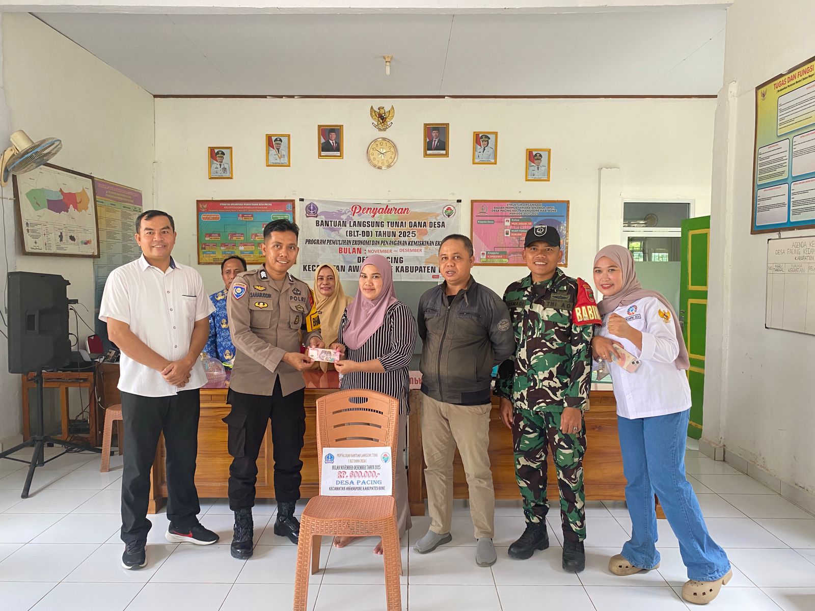 Pelaksanaan penyaluran BLT-DD ini dihadiri oleh sejumlah unsur pemerintahan dan keamanan yang turut memastikan kegiatan berjalan tertib dan lancar. Hadir dalam kegiatan tersebut antara lain Kasi Pemerintahan Kecamatan Awangpone A. Syail Askari, SE, Pendamping Desa Pemberdayaan Kecamatan Awangpone Muh. Tang, ST, Babinsa Desa Pacing Serda Asmadi, serta Bhabinkamtibmas Desa Pacing Brigpol Saharuddin, S.Sos. Selain itu, Ketua BPD Desa Pacing Lel. Muh. Ihsan, SE, Sekretaris Desa Pacing Lel. Gunawan, SH, Pendamping Lokal Desa Perp. Alpianda Alimin, A.Md.Keb, para kepala dusun, perangkat desa, serta masyarakat penerima bantuan juga turut hadir.