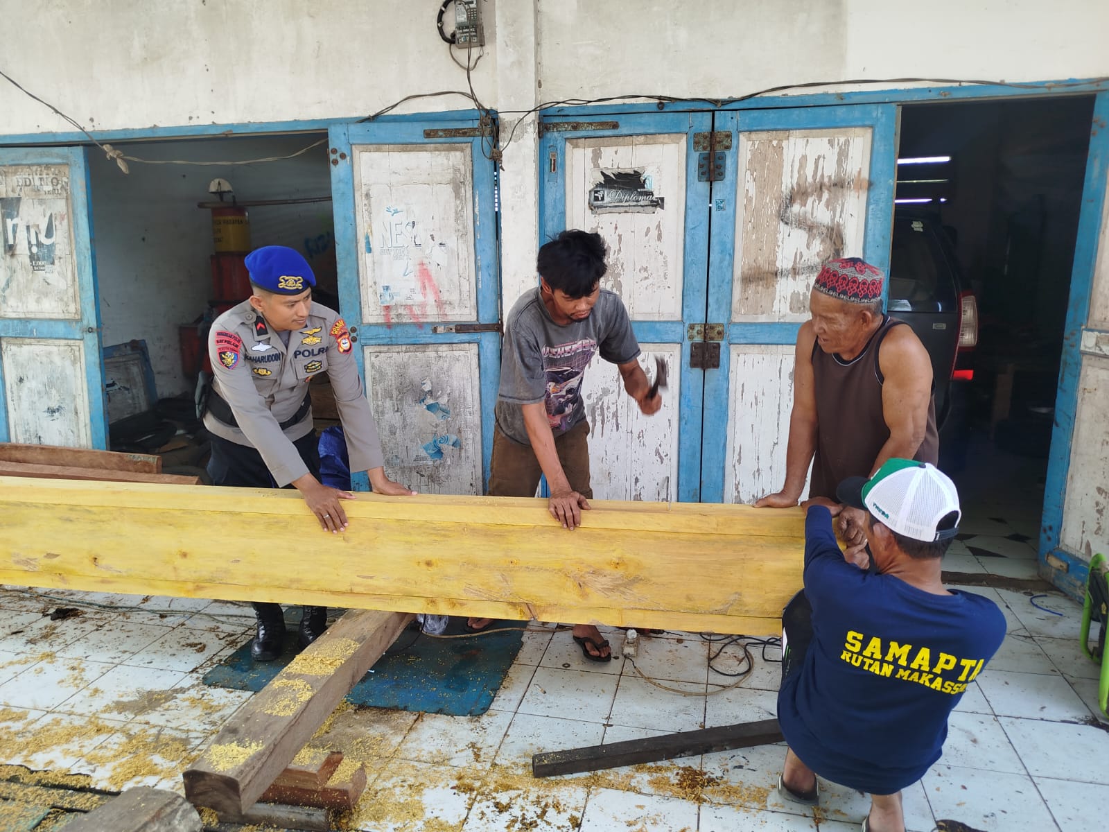 Dalam kegiatan yang dikemas melalui program Polisi Penolong ini, Abripda Kaharuddin membantu nelayan membuat papan seluncuran es balok untuk digunakan nelayan ketika hendak memuat es balok ke atas kapal.